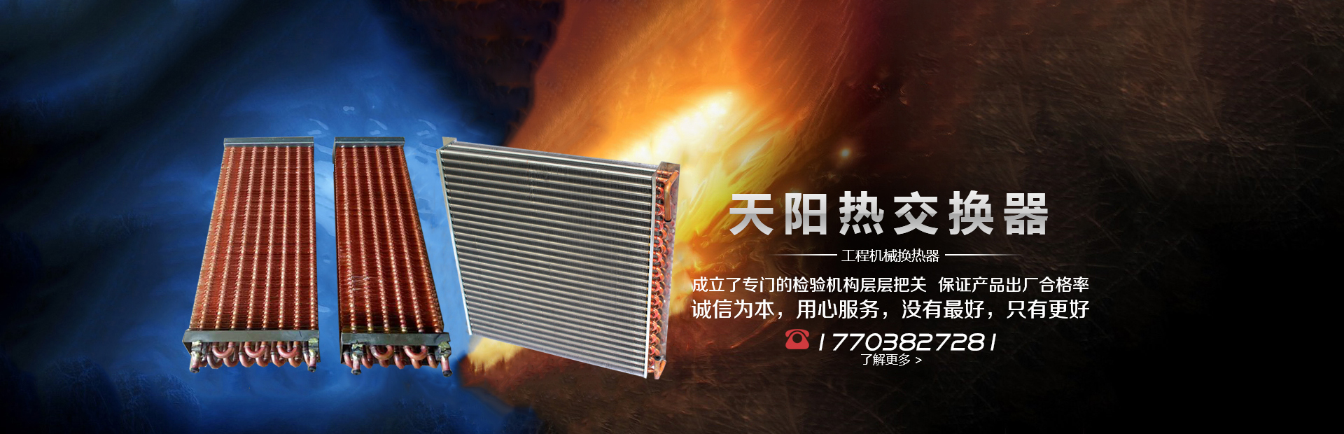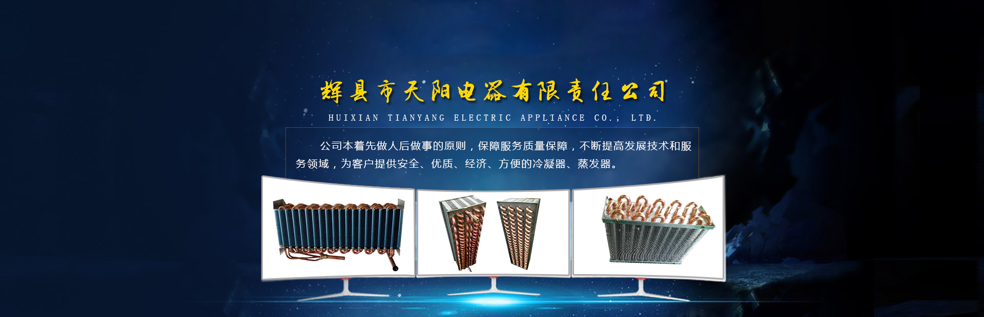 輝縣天陽電器有限責(zé)任公司位于肥沃的中原河南省輝縣市學(xué)院路中段工業(yè)集聚區(qū)興業(yè)園3號廠房,以制冷設(shè)備用冷凝器,蒸發(fā)器,熱交換器為主。主要材料為銅管鋁翅片,銅管銅翅片,鋁管鋁翅片。廣泛應(yīng)用于冰箱冰柜,制冷設(shè)備,暖通設(shè)備,空調(diào),自動售貨機,冷干機,超市立風(fēng)柜,冷藏車,烘干機等產(chǎn)品領(lǐng)域。  公司自1998年成立以來,始終堅持:“科技造就產(chǎn)業(yè)、質(zhì)量成就信譽、誠信鑄就輝煌”的質(zhì)量方針,從產(chǎn)品拓展上堅持“人無我有,人有我優(yōu),人優(yōu)我特的”經(jīng)營理念,25年來,從1998年開始供應(yīng)河南冰熊集團下屬的冷柜廠,制冰機廠各種冷凝器;2003年之后,原冰熊集團的精英志士開始在全國各地發(fā)展,所到之處依托我公司供貨,以致于多家目前已具行業(yè)中佼佼者的公司,從而建立了如凱雪公司,兆邦公司、凌云公司、海寶公司、正雪公司、上海忠云、山東德萊維等幾十余家公司在草創(chuàng)時期的啟蒙供貨商,友好共贏長達十余年,成為我國制冷行業(yè)的供應(yīng)商。以致在2015年初雙匯集團面向社會的招標(biāo)書中指名要我公司冷凝器、蒸發(fā)器指定產(chǎn)品供應(yīng)商